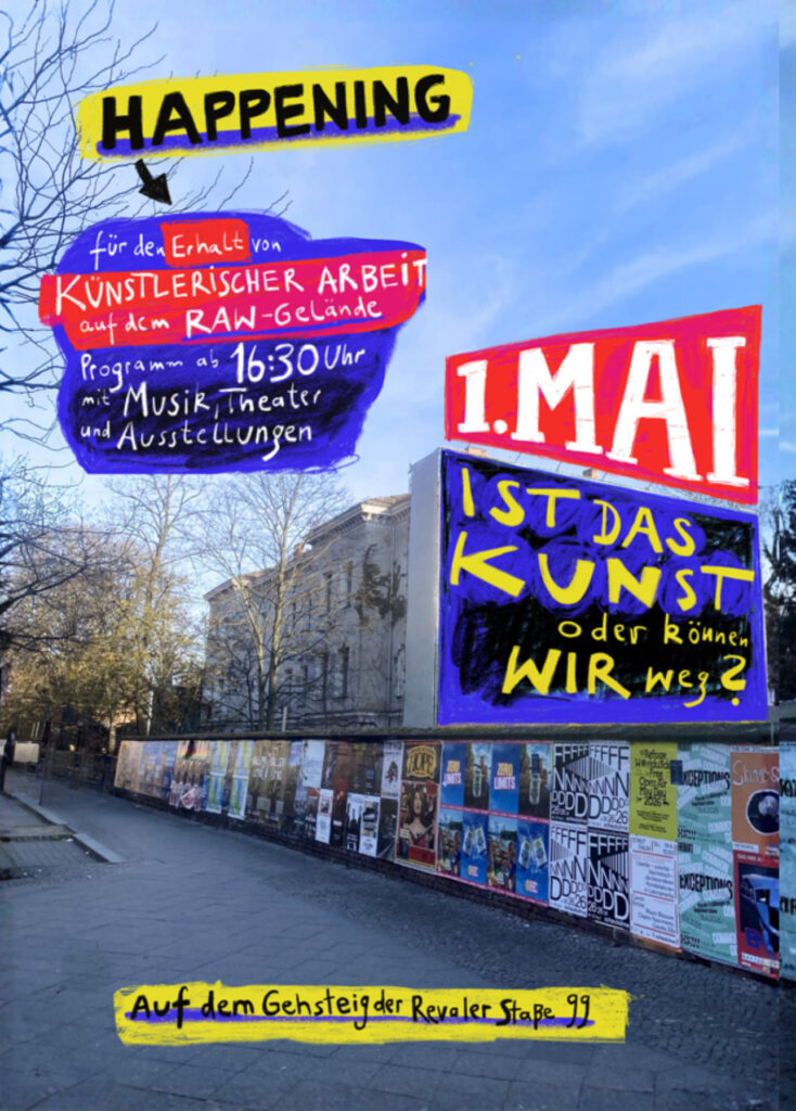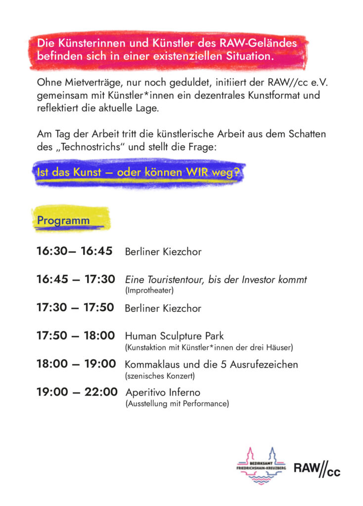 Am Tag der Arbeit wollen wir künstlerische Arbeit sichtbar machen und uns für deren Erhalt auf dem RAW-Gelände einsetzen. Die Aktion beinhaltet ein kuratiertes Programm, das von 16:00 bis 22:00 Uhr auf dem Gehsteig zwischen SGL und BWH mit Chor, Musik, Theater und Ausstellung stattfindet und sich anschließend in den beiden Häuser fortsetzt.
